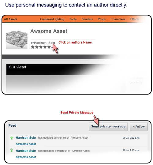 From the asset page, click on the authors name. This will take you to the authors page where you can find the button for personal messages.